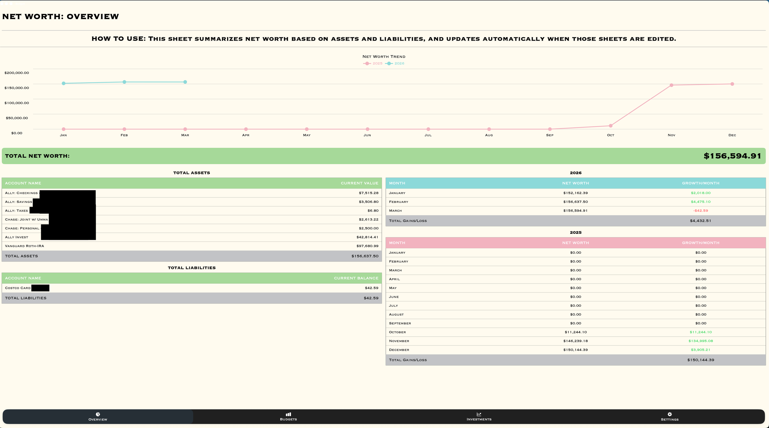 Despite overspending a little bit, I somehow still made some progress along the way. I think part of the reason is that some of the gains weren’t reflected in the last net worth calculation because of the ACATS transfer timing, so things looked lower than they actually were during the consolidation process. Now that everything has settled and is properly accounted for, as of the end of February 2026 my net worth stands at $156,594.91. Not perfect execution this month, but still moving in the right direction — and that’s what matters.